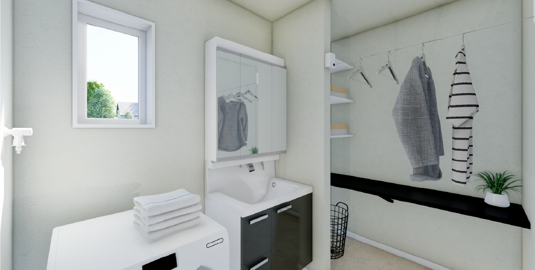 物干しワイヤー付きで、花粉の時期や天候を気にせず洗濯物を干せるうえ、カウンターでそのまま畳むこともできて便利です。