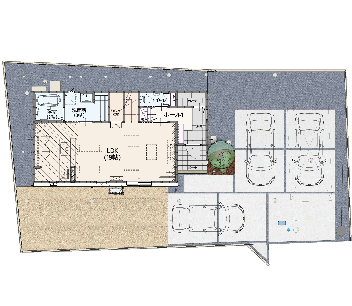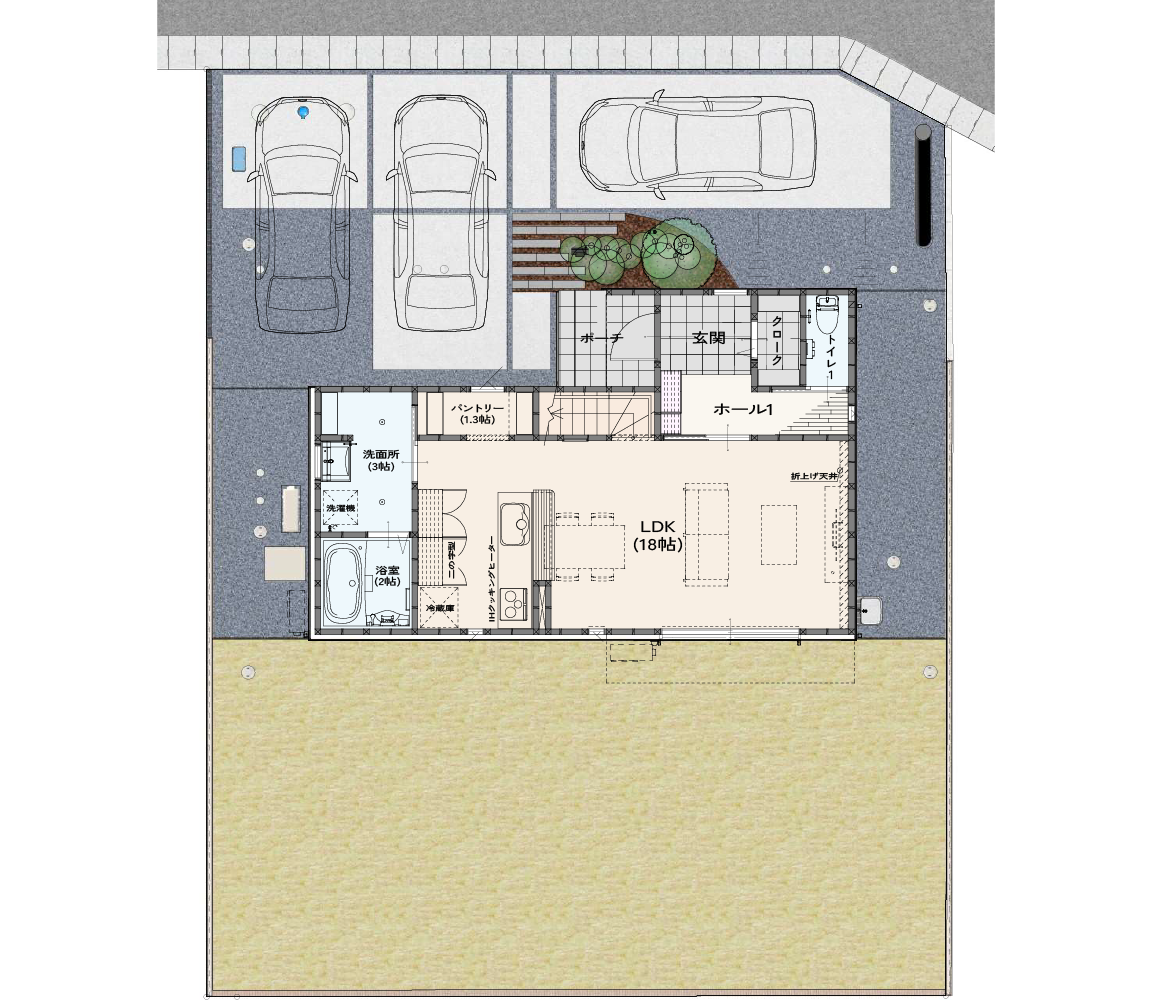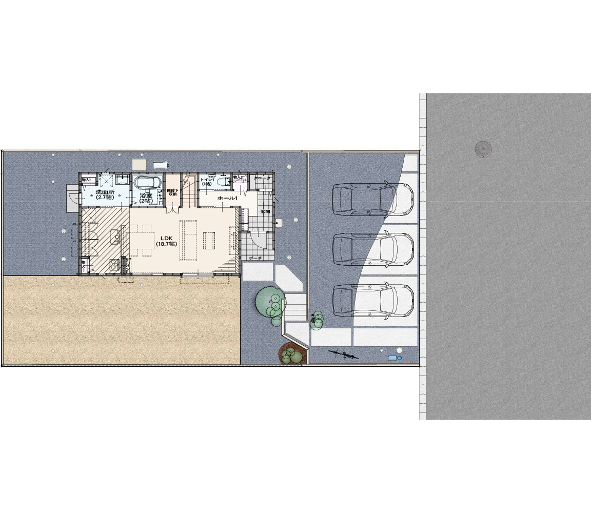 ノーブルホームの戸建ては全て駐車スペース2台以上。ほとんどの物件で3台を確保しています。お客様の今だけでなく、来客時や将来のことも考えた外構計画を行っています。