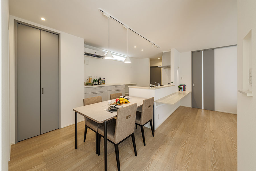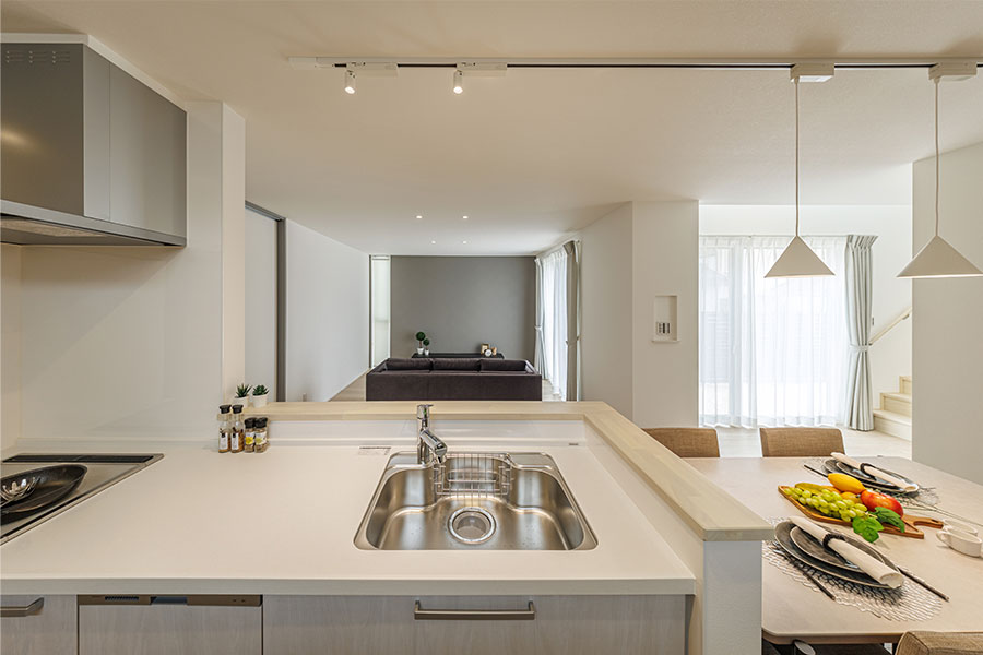 4.洗面所と浴室をキッチンの後ろに隣接することで効率がUP。毎日の行き来が楽になります。