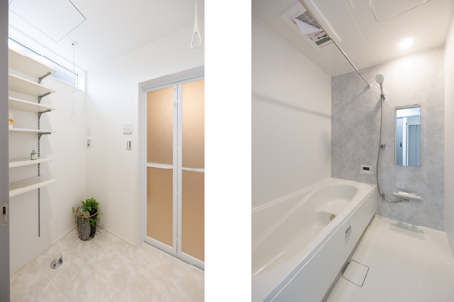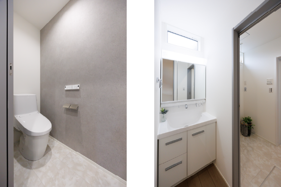 洗面化粧台をホールに配置。手洗い場と脱衣所を独立させて、プライバシーを確保。