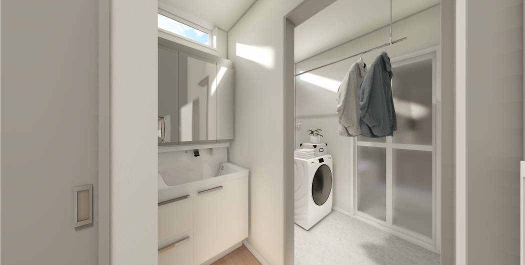 洗面化粧台をホールに配置。手洗い場と脱衣所を独立させて、プライバシーを確保。