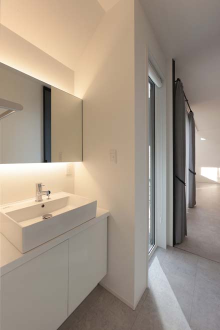 ■脱衣室内で室内干しができて洗濯物をたためる家事スペース