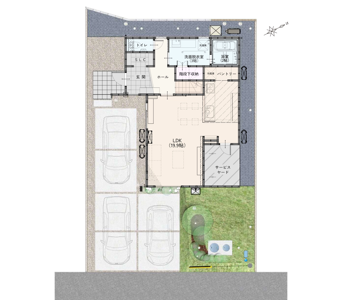 2. リビングにつながる半屋外サービスヤード。洗濯物干しやアウトドア用品の収納など、使い方は無限大です。