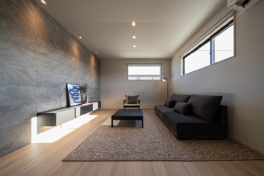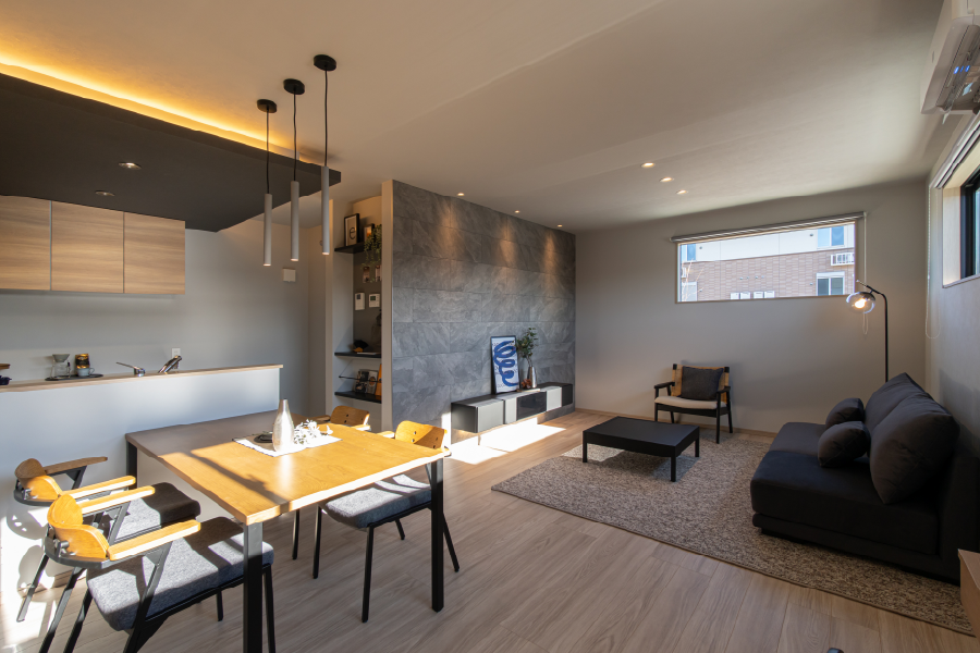 5. 木目の温もりに、グレーとブラックのトーンを合わせ、落ち着きと品格を感じるホテルライクなインテリアです。
