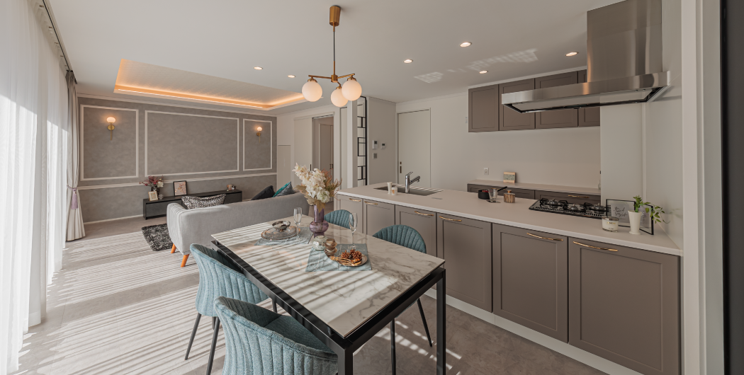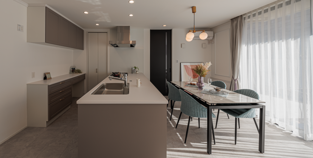 ◎キッチンは框デザインと真鍮の取っ手で落ち着いたホテルライクな空間を演出
