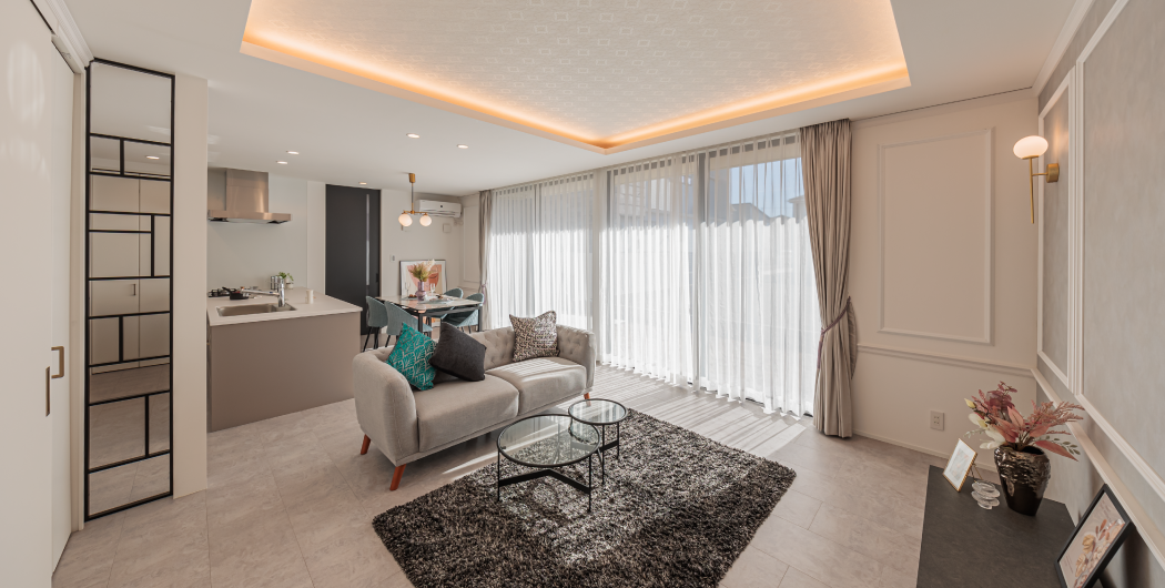 ◎天井と壁には重厚感を演出するモールディングでフレンチシックな空間に