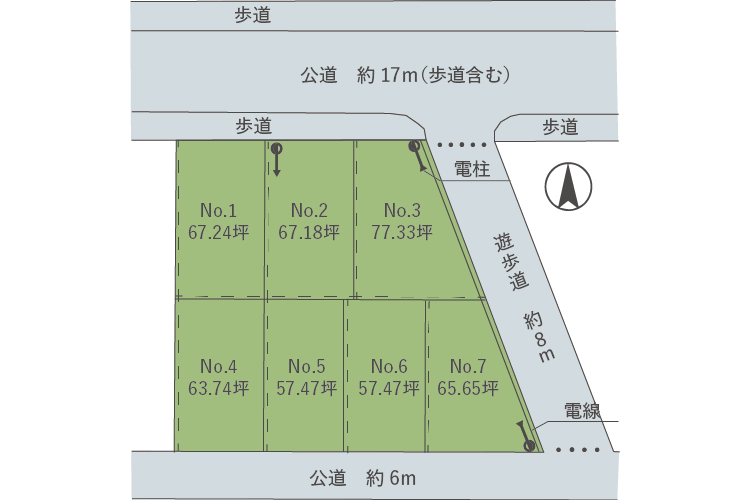 暮らしやすさを追求した分譲地計画分譲地の道路は「開発道路」と言われ、都市計画法による開発許可を受けて設置された公共的な施設です。管理が市町村となるため、コンクリートなどが劣化した場合には市町村が修繕してくれる他、建築基準法により私道よりも道幅が広く、分譲地内での車同士のすれ違いや駐車のしやすさが特徴です。