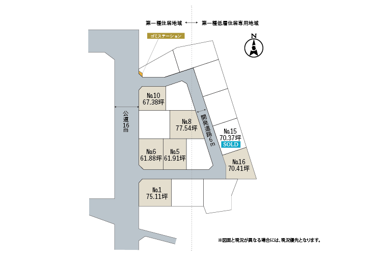西側公道:約16m、分譲地内開発道路:約6m