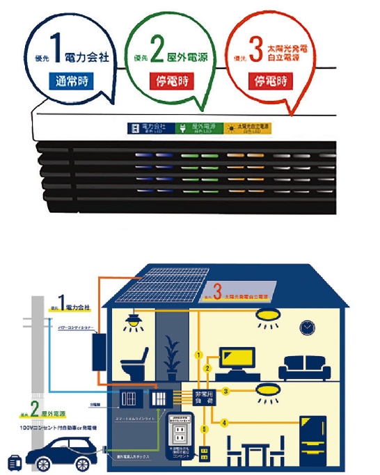 「スマートエルラインライト」は、エコカーを停電時にも室内で電気が使用出来るようになるシステムです。このシステムにより、エコカー、太陽光発電、発電機や蓄電池からも電源供給が可能になります。