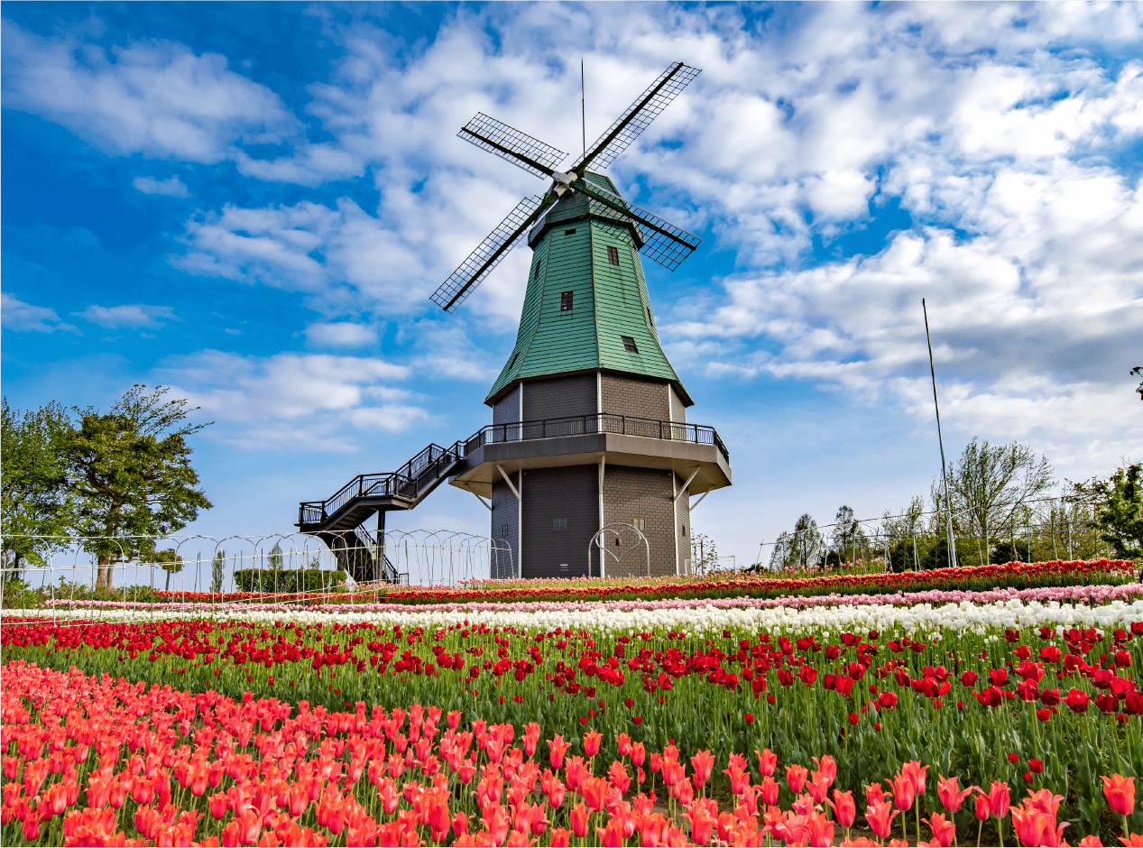 チューリップ畑に建つシンボルのオランダ式風車や魚類・鳥類が観察できるネイチャーセンター、プール、グラウンド、テニスコートなど、家族みんなで自然やスポーツを楽しめます。