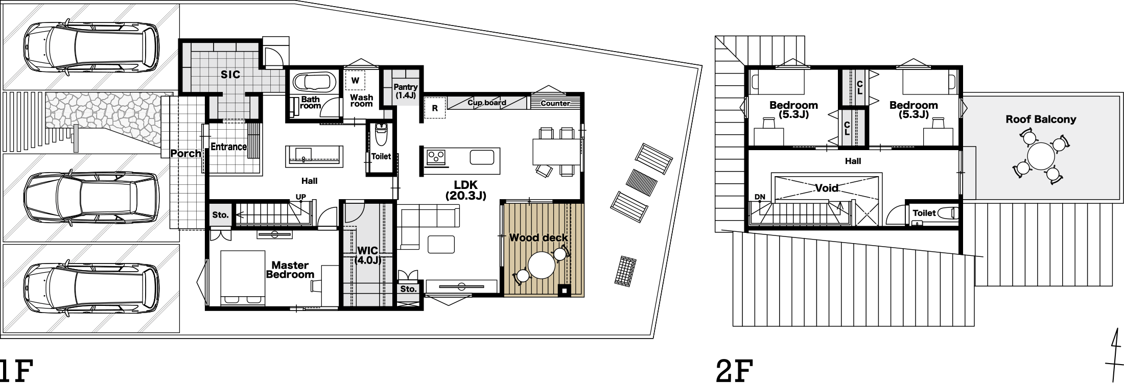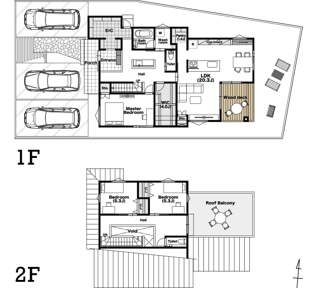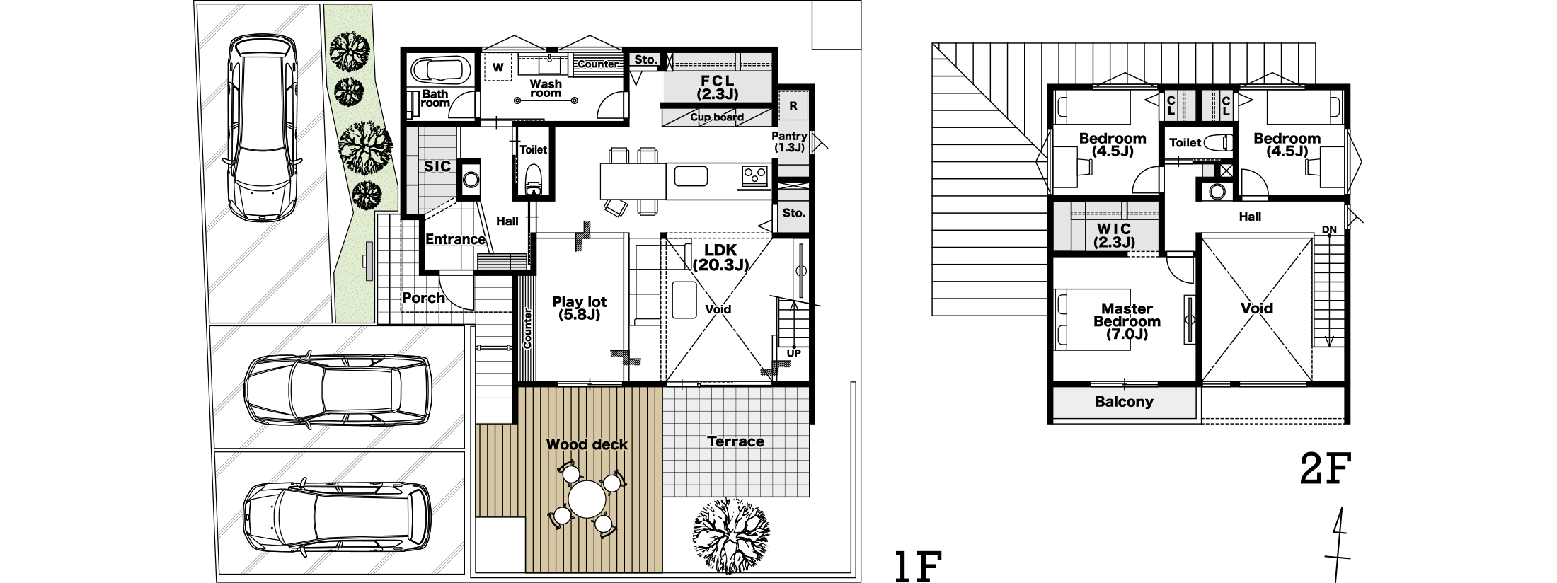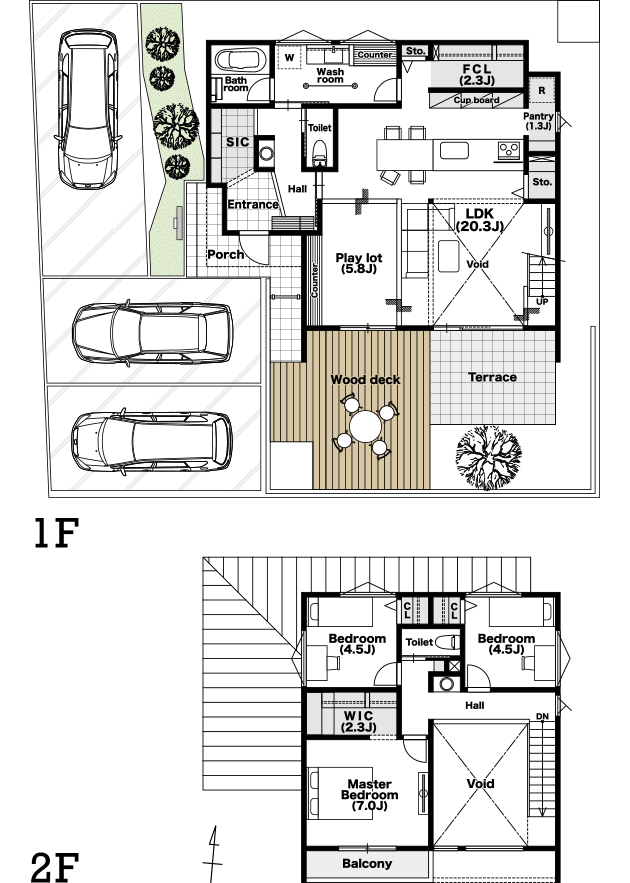 広さに特化するだけではなく、プレイロット、外から視線が入らないウッドデッキとタイルのテラス、20帖超のLDKに大きな吹き抜けをプランニング。暮らしの用途に合わせて使い分けられるワクワクするような空間をご用意。