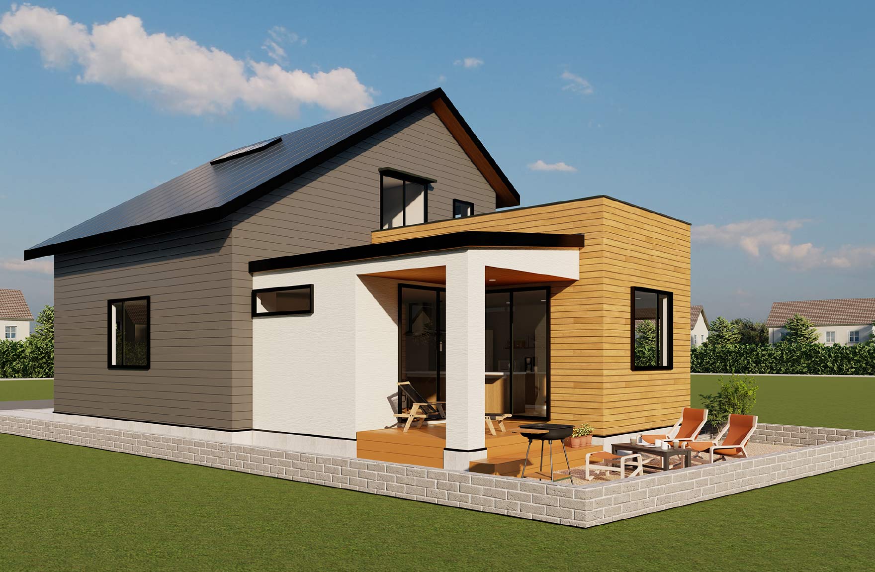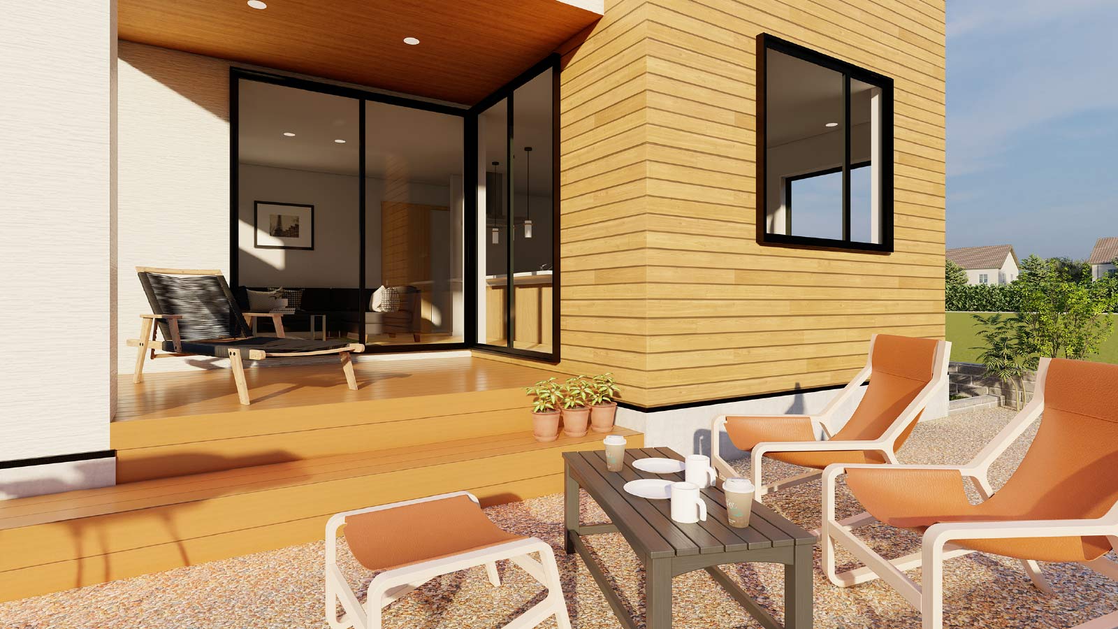 リビングの前面に配置した南面ウッドデッキ&ガーデン。BBQやプール遊びなど家族みんなで思いっきり楽しめる空間です。