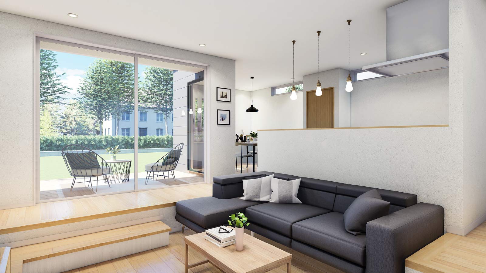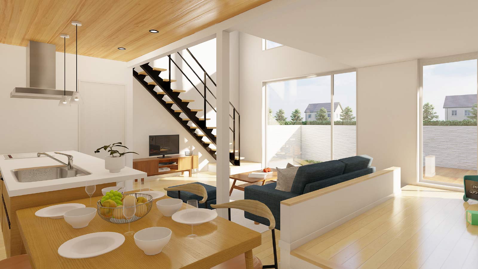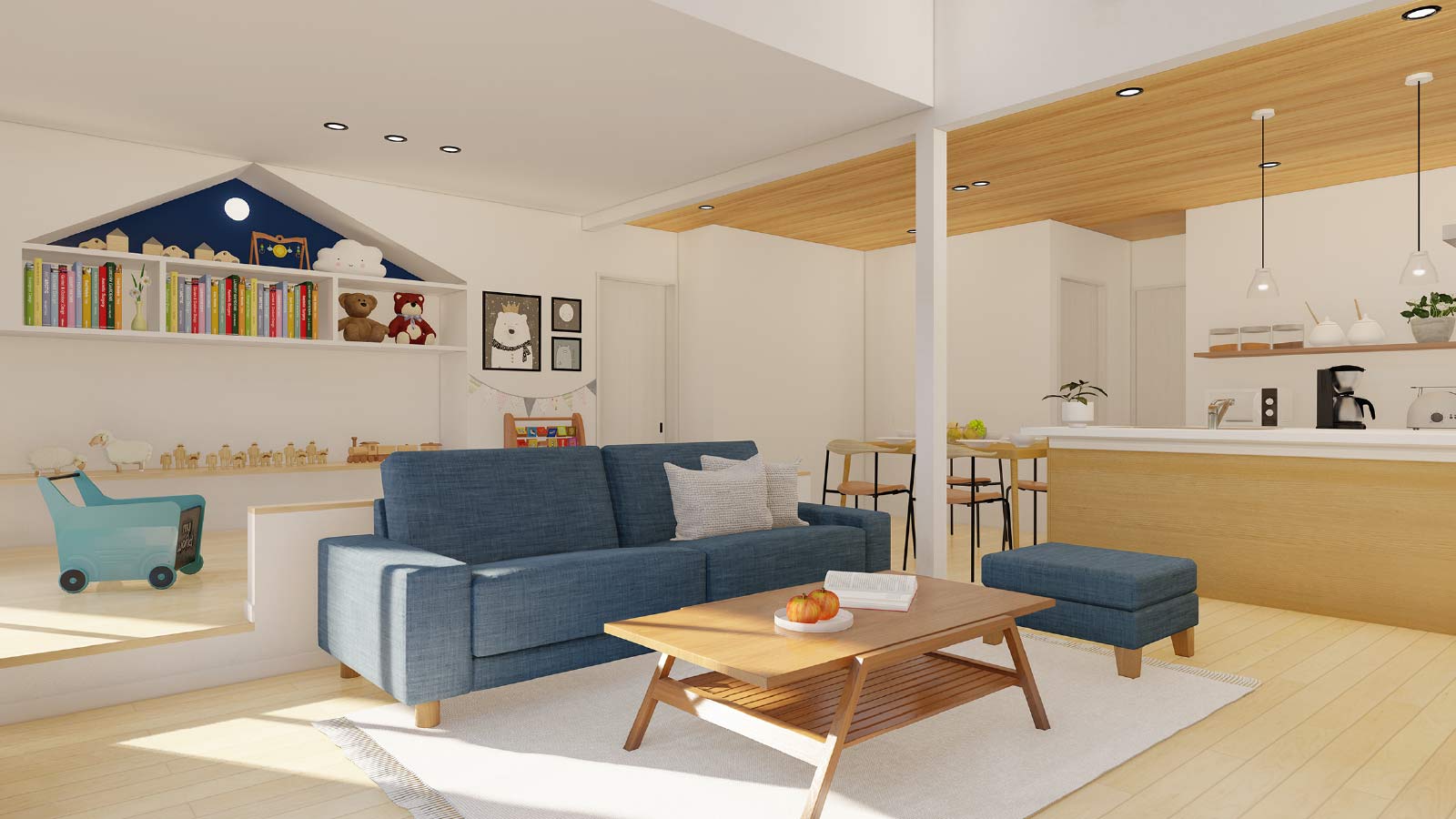 1階フロア全体を見渡せるパントリー付きの広々キッチン。目の前に広い住空間とテラススペース、そして家族のシーンが広がります。