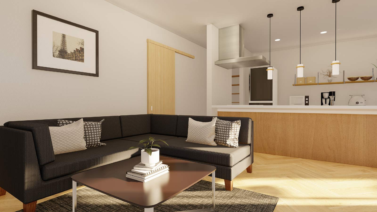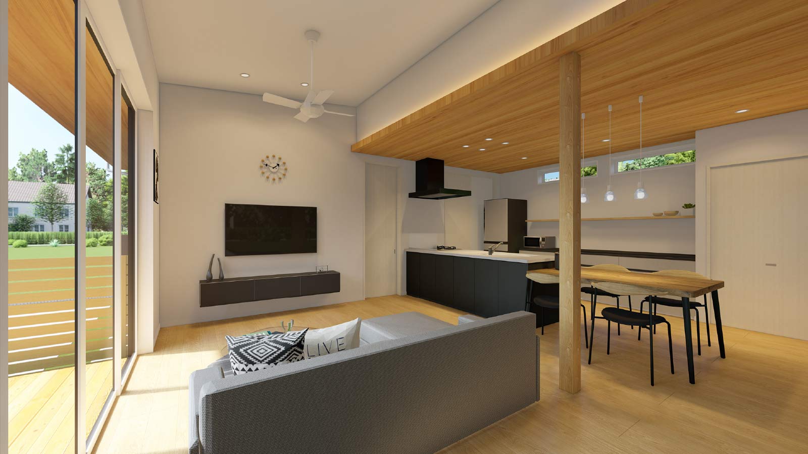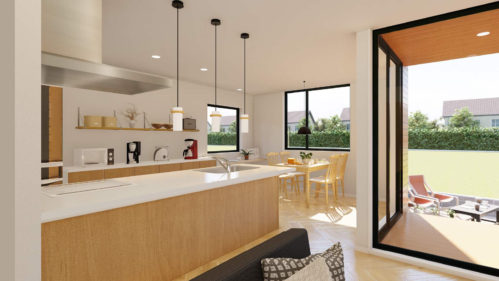 1階フロア全体を見渡せるパントリー付きの広々キッチン。目の前に広い住空間とテラススペース、そして家族のシーンが広がります。