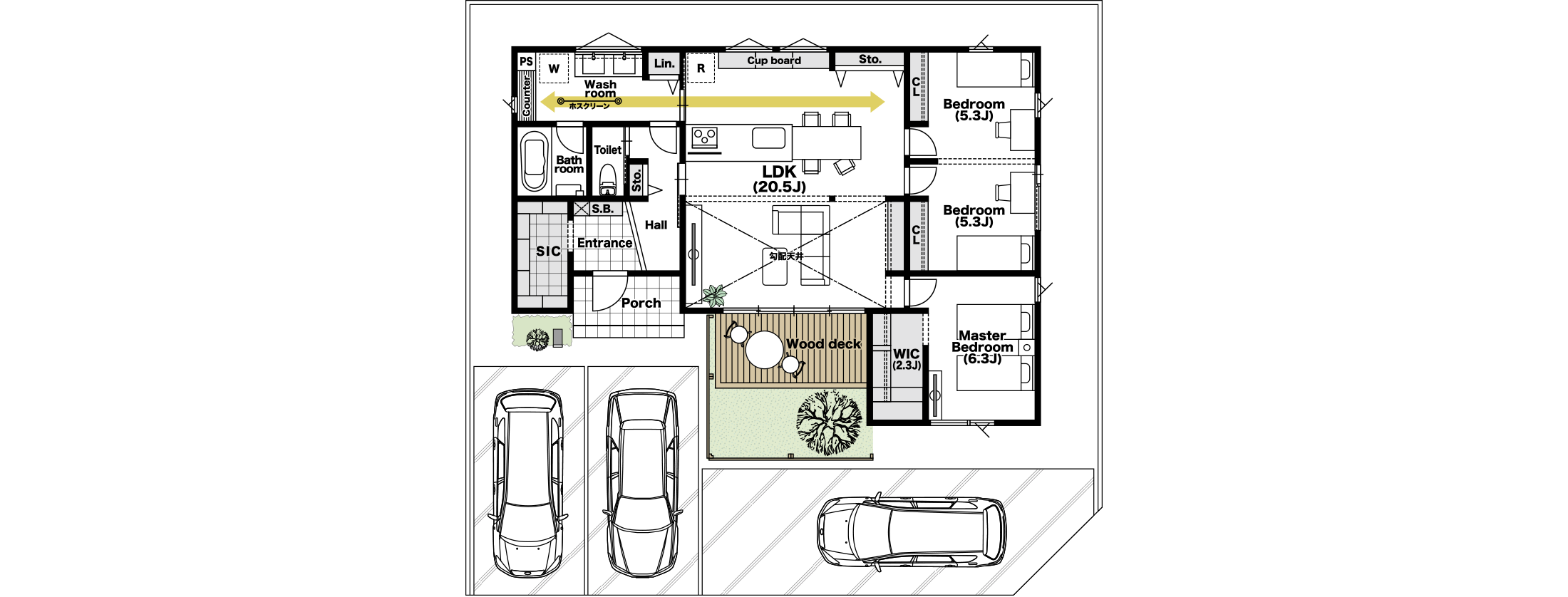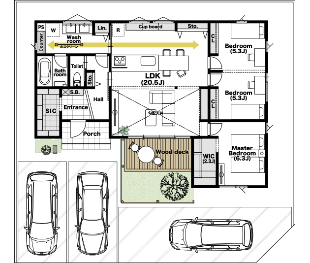 キッチンと洗面室が隣り合う効率的な動線の平屋の家。ワークカウンター・室内干しスペース・リネン庫・キッチン収納など、ママの笑顔が溢れるアイデアが満載。ウッドデッキ&LDK20.5帖と暮らしの広さもしっかり。