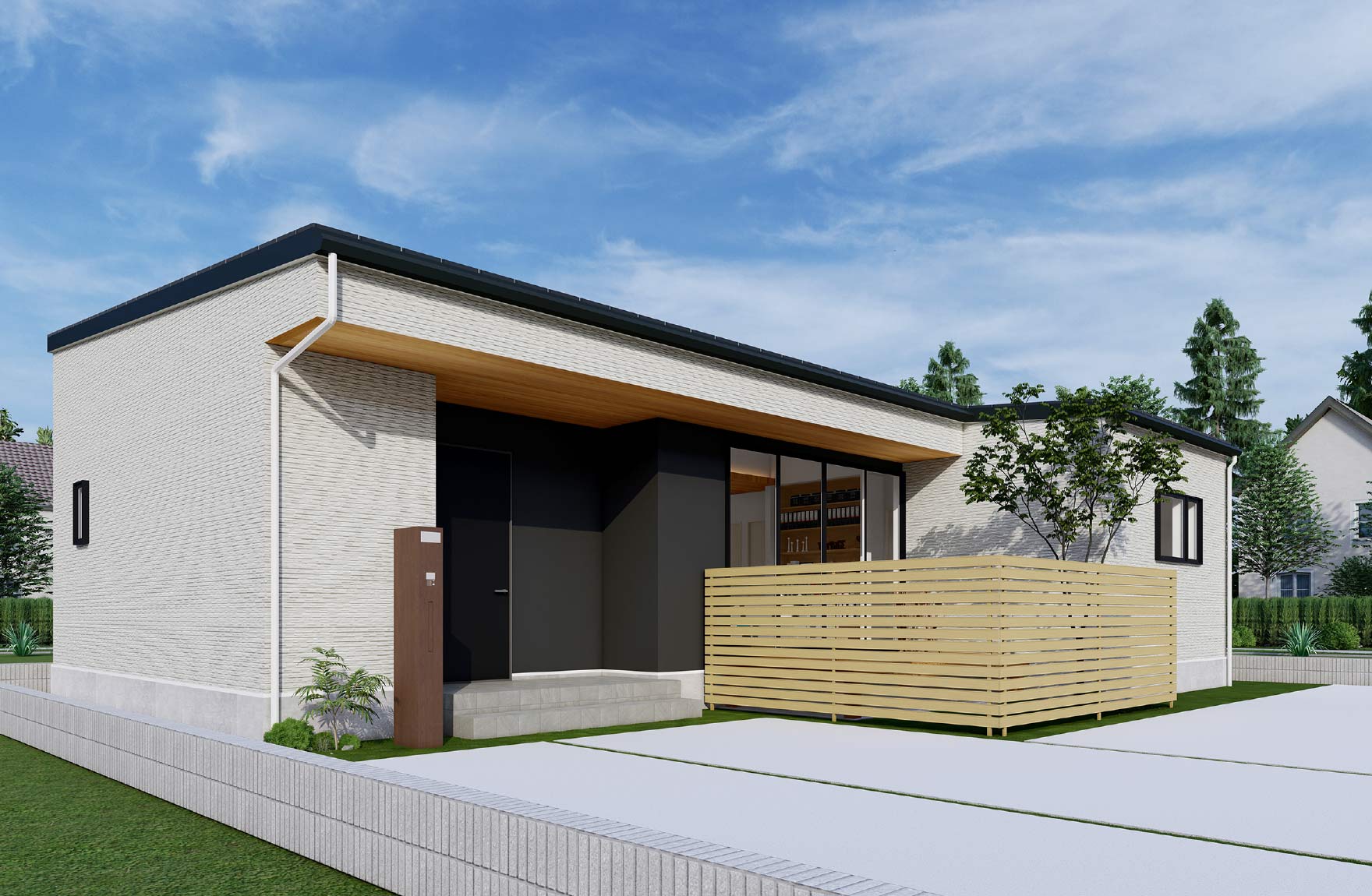 外から家の中が見えないデザインの玄関。コンパクトながら土間タイプの収納が機能的です。