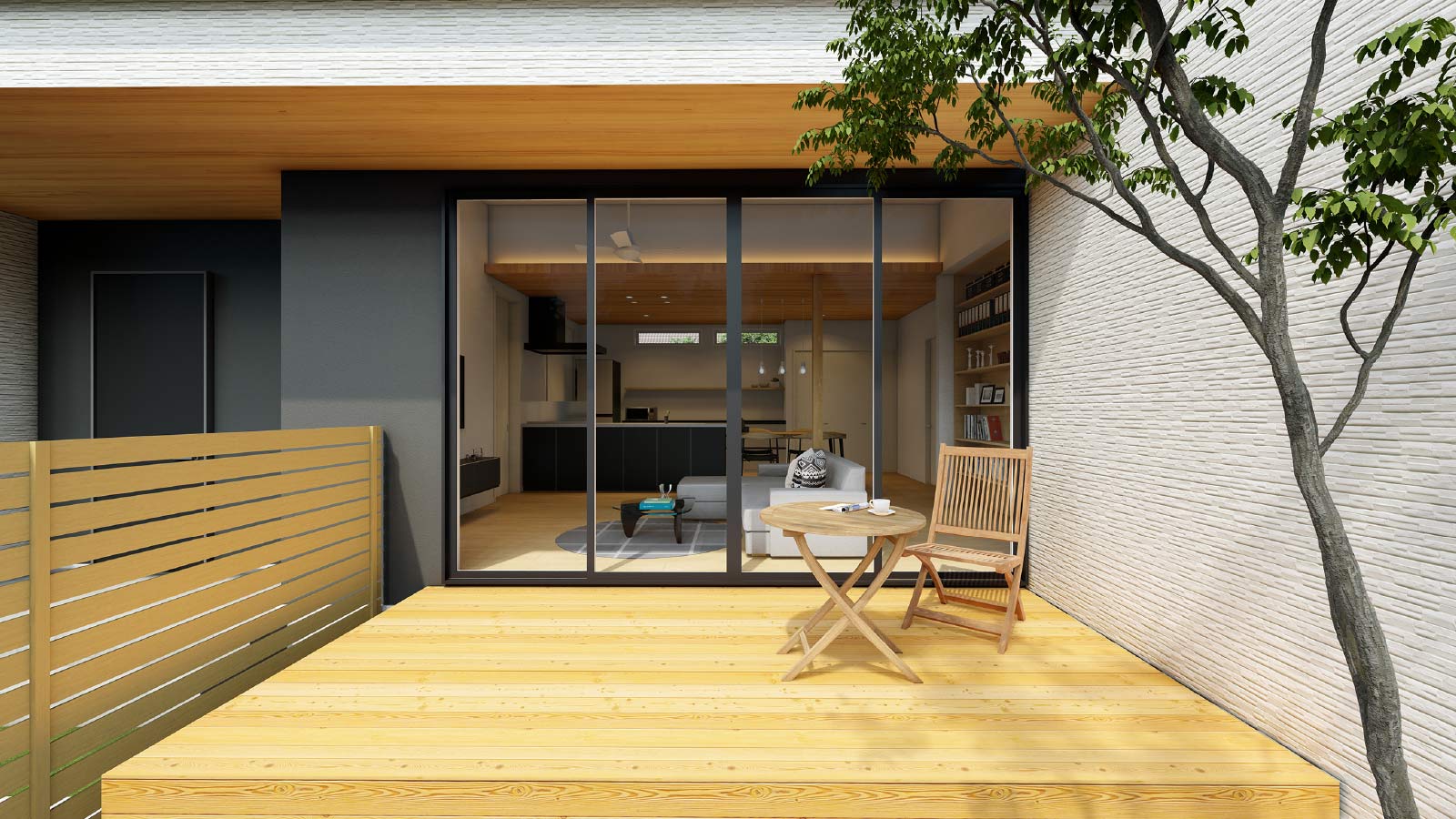 リビングの前面いっぱいに配置したウッドデッキ&ガーデン。家族みんなで思いっきり楽しめる空間です。