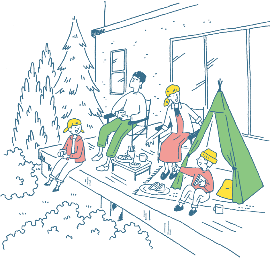 南東の屋根付きウッドデッキは一年中使える優れもの。ウッドデッキに腰掛けて、家族みんなでおうちキャンプをエンジョイ!