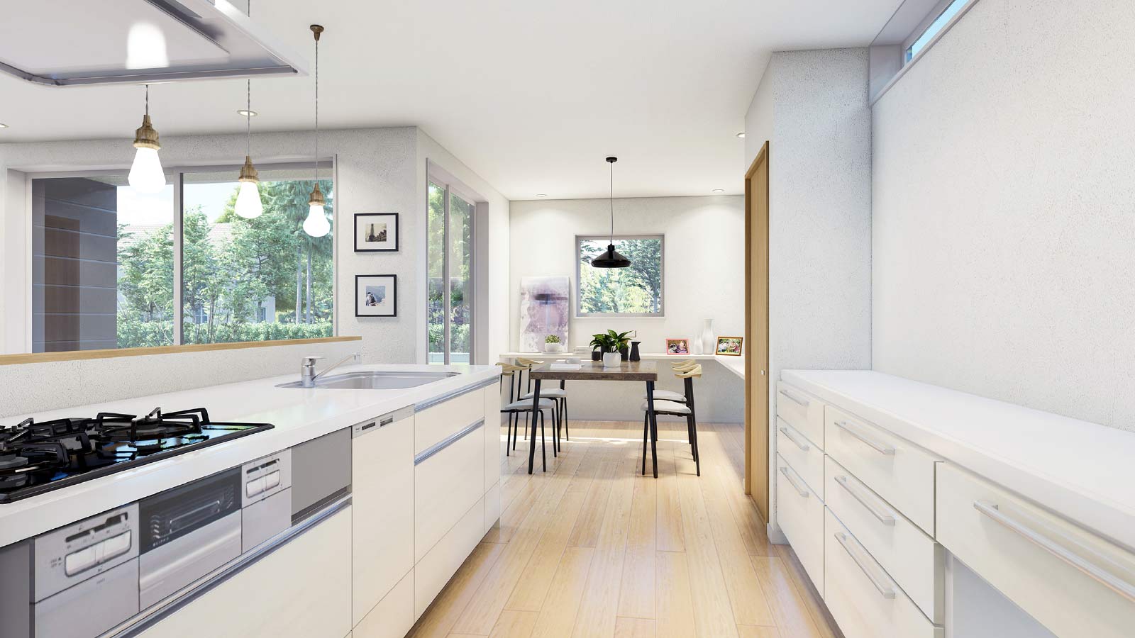 キッチンの右手にはパントリー、左手にはカウンター。暮らしの可能性が広がるアイライド型キッチン。キッチンからの眺めも最高です。