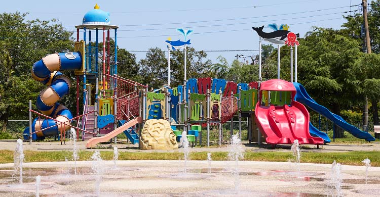 広場や遊具に加え球場や武道館などがある「山吹運動公園」。大小さまざまなサイズのすべり台や噴水に子どもたちは大喜び。子どもや友だち家族と一緒に、近場で過ごす際に嬉しい公園です。
