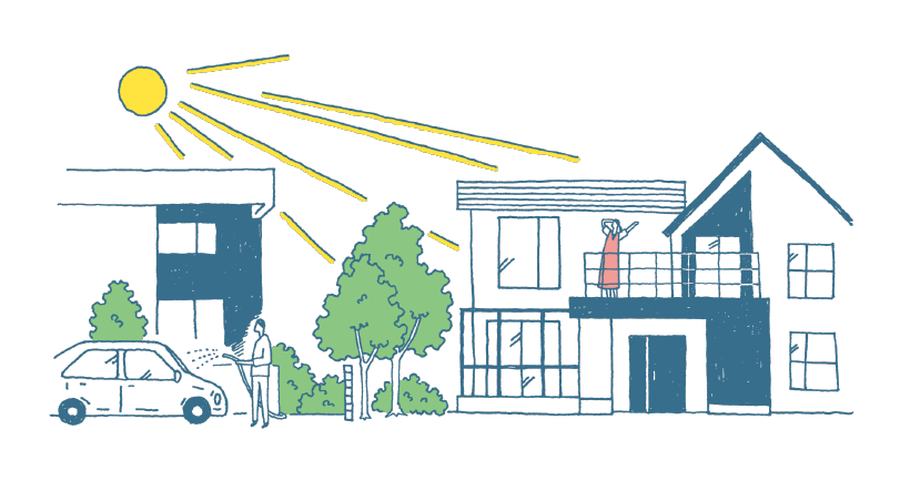 家にはオーダーメイドによるご家族らしさを反映しながらも、街区には一体感を生み出すため、共通のデザインの門灯や、植栽(シンボルツリー)を設えます。