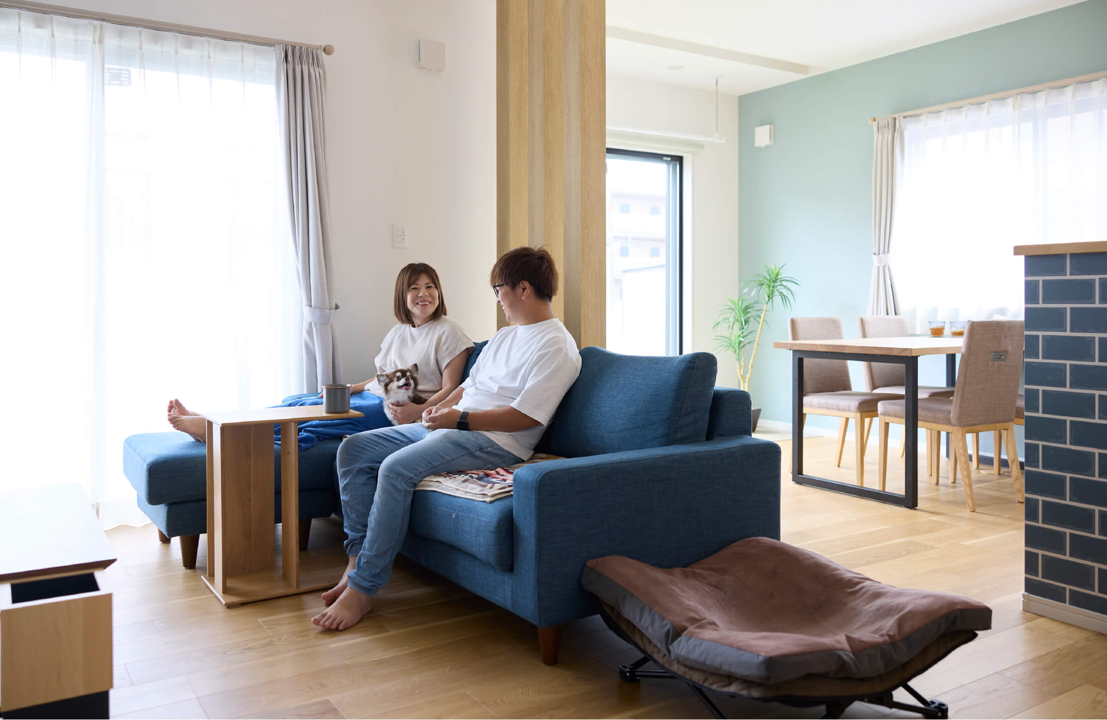 爽やかな陽光がたっぷりと舞い込む、ナチュラルなカラーリングを基調としたH様邸。心地よい静けさに包まれるその住空間には、ソラくんを中心に和やかな笑顔が広がっていました。