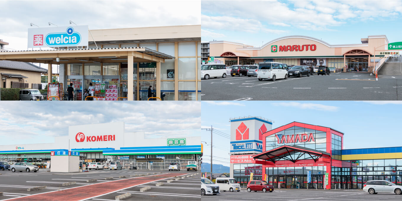 複数のスーパーやコンビニがある磯原駅前。そして、分譲地の南に位置する上桜井・中郷エリアには、ホームセンター・家電量販店・飲食店が軒を連ねます。車や自転車で、サッと行ける施設がたっぷり。